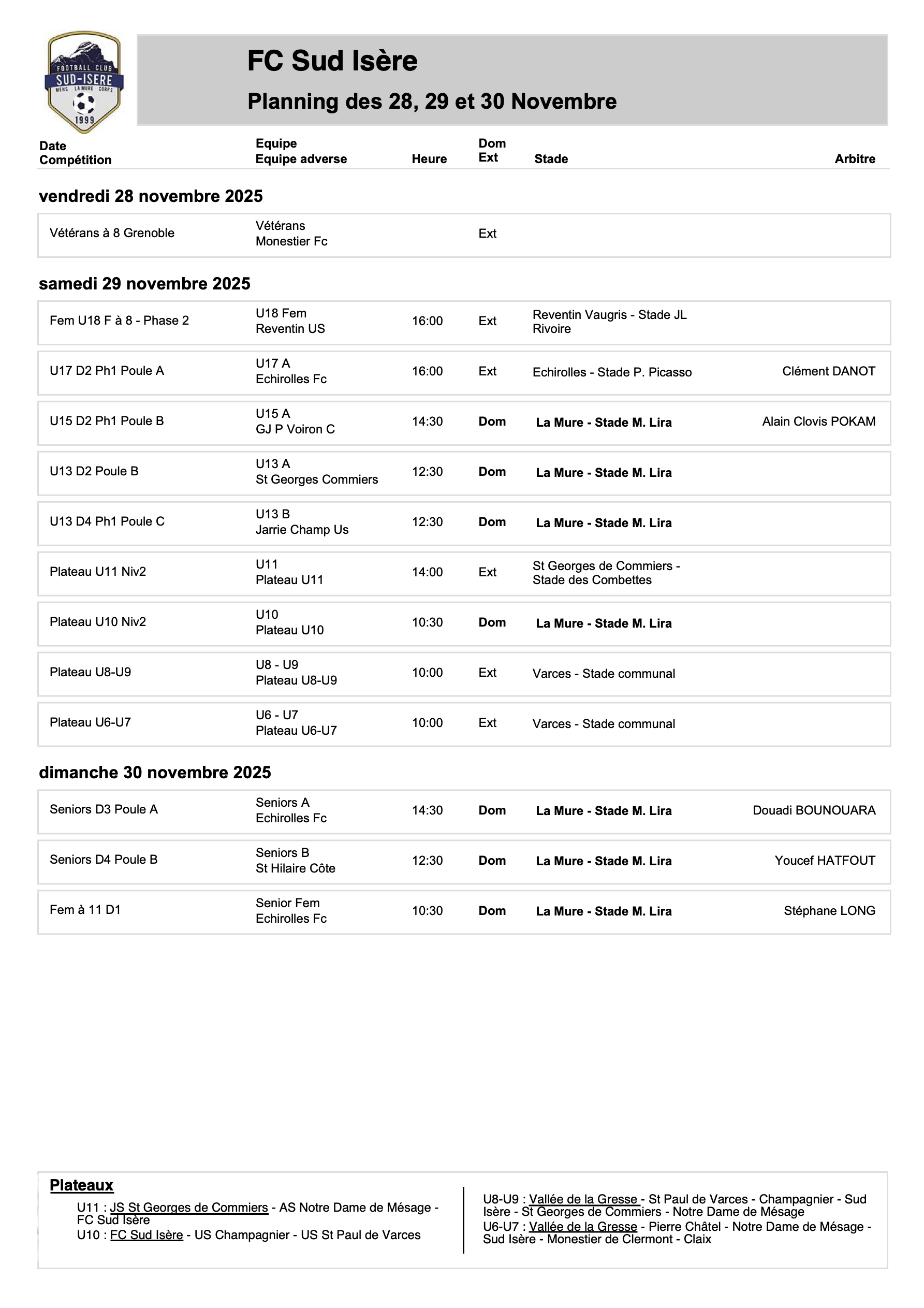 Planning des rencontres des 28, 29 et 30 Novembre