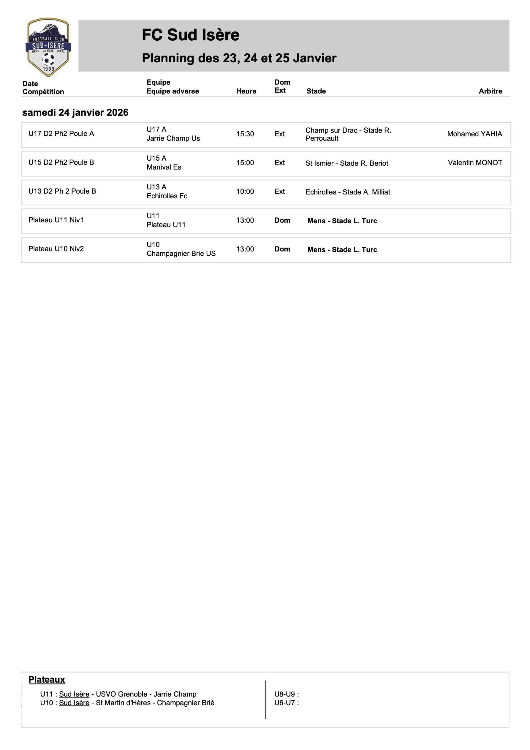 Planning des rencontres des 23, 24 et 25 Janvier