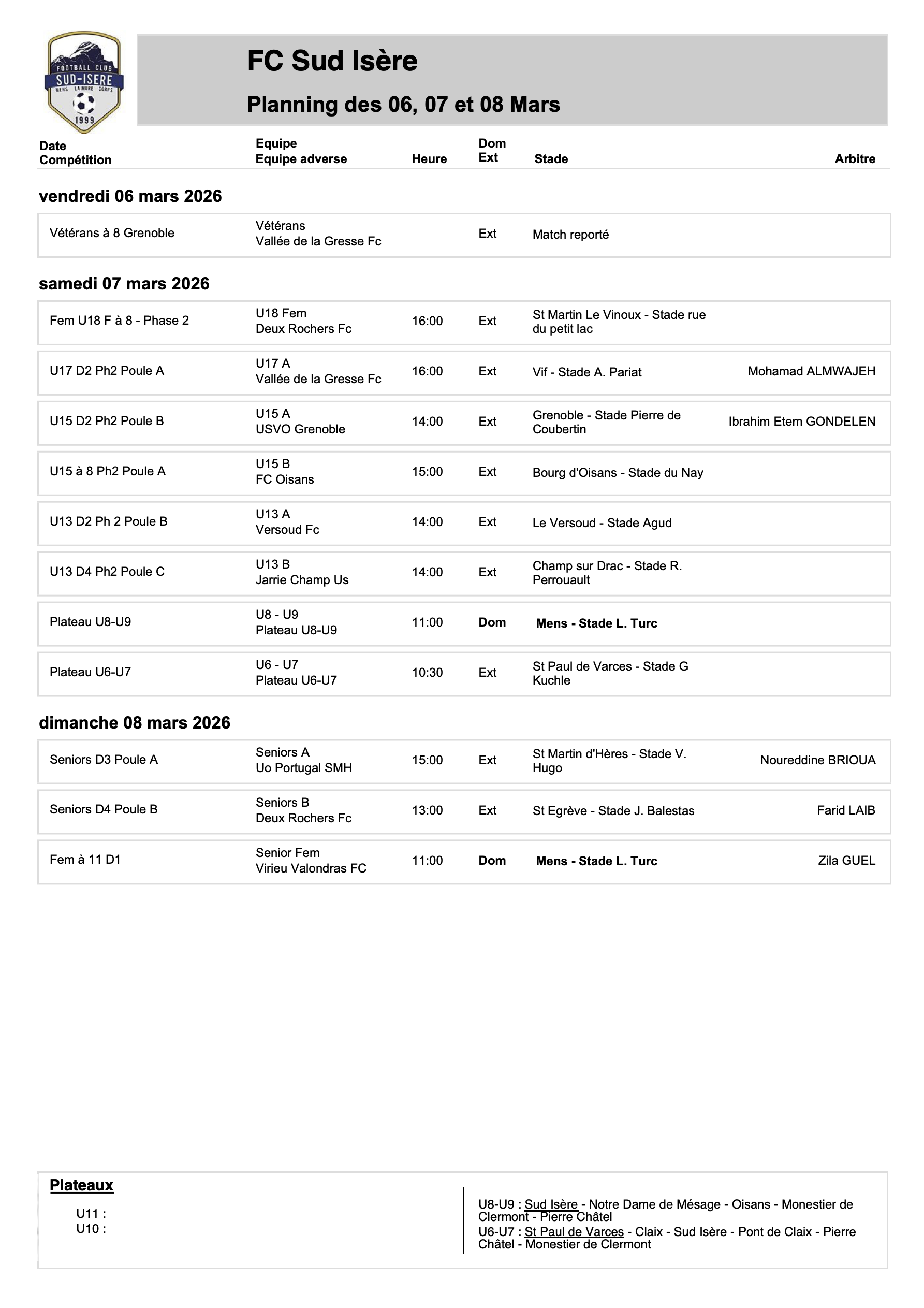 Planning des rencontres des 06, 07 et 08 Mars