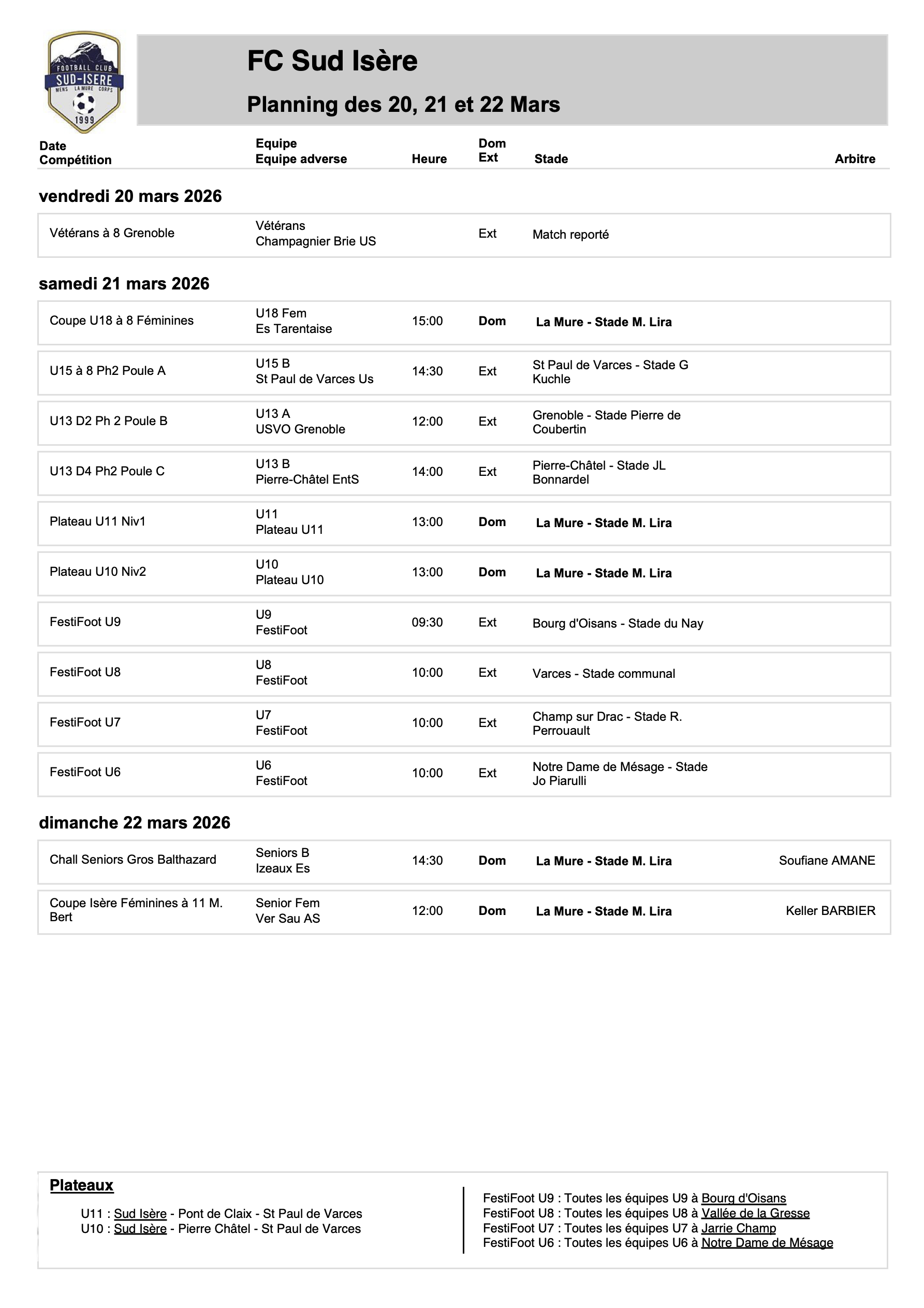 Planning des rencontres des 20, 21 et 22 Mars