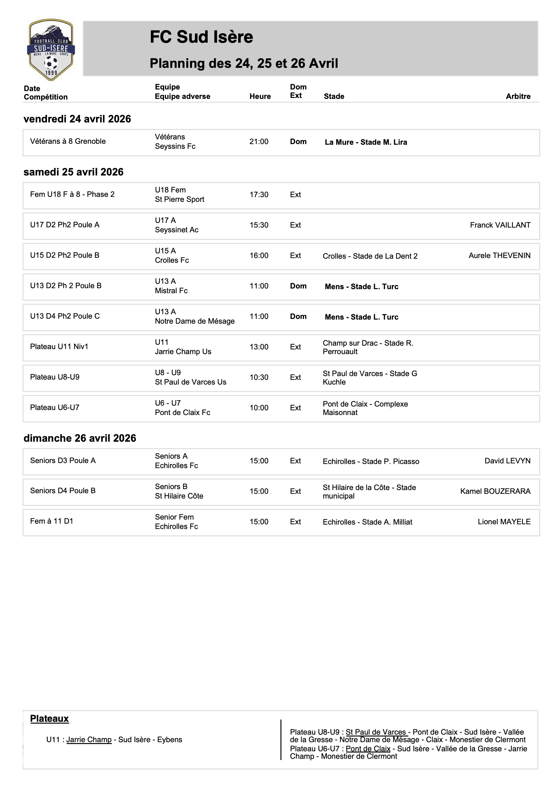 Planning des rencontres des 24, 25 et 26 Avril