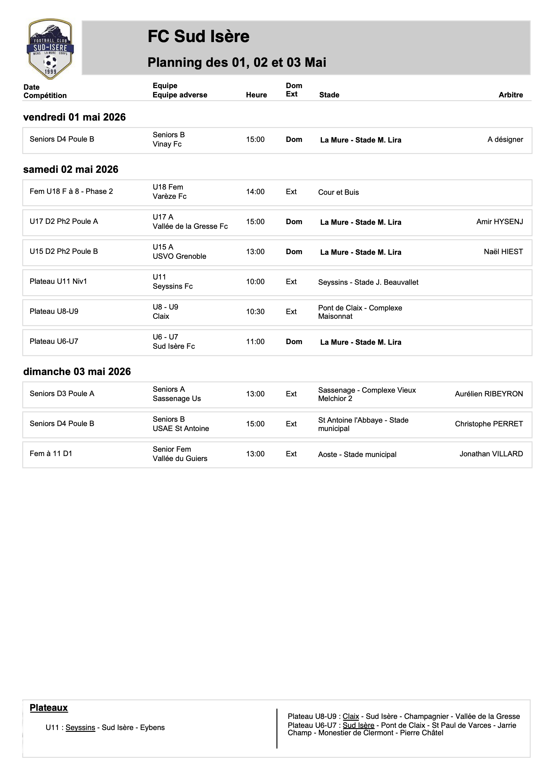 Planning des rencontres des 01, 02 et 03 Mai